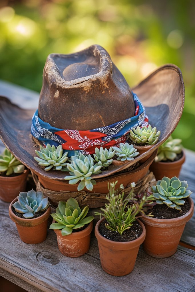 Picture a classic straw cowboy hat sitting slightly tilted, adorned with a vibrant bandana tied around the brim. Small potted succulents nestle inside the hat, their rosette-shaped leaves spilling over the edges. The succulents provide a pop of green against the rustic straw, while the bandana adds a splash of color and pattern. It’s a quirky, charming focal point that marries practicality with style, perfect for casual outdoor gatherings.
