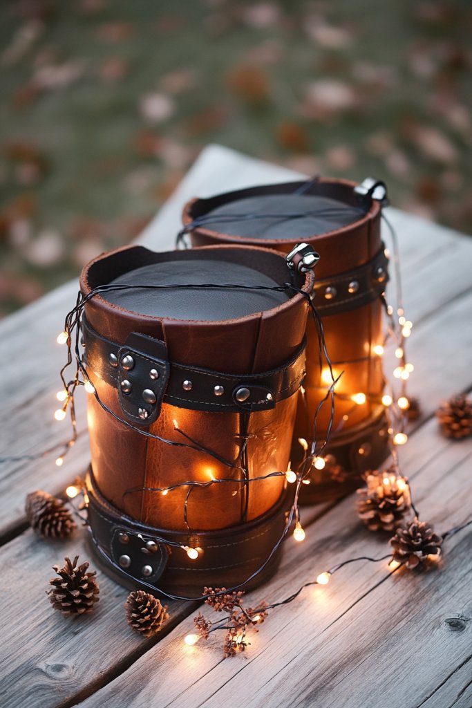 Start with vintage or faux leather strips, cutting them to size for wrapping lanterns or candle holders. Secure the leather with metal studs, rivets, or strong adhesive, ensuring it stays snug. Insert LED candles or string lights inside the lanterns—battery-powered options work best for flexibility. Arrange the lanterns at varying heights on tables or along pathways, using stands or hooks. Add extra touches like tassels or fringe for a more authentic look. The goal is warmth, texture, and rustic charm.