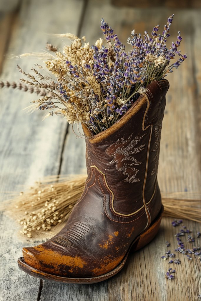 Tired of traditional floral arrangements that feel too formal or predictable? Want to add a quirky, rustic touch that makes your guests do a double-take? Using a cowboy boot as a vase injects humor and personality into your decor while still being functional. It’s a perfect blend of practicality and country charm that instantly personalizes your space.