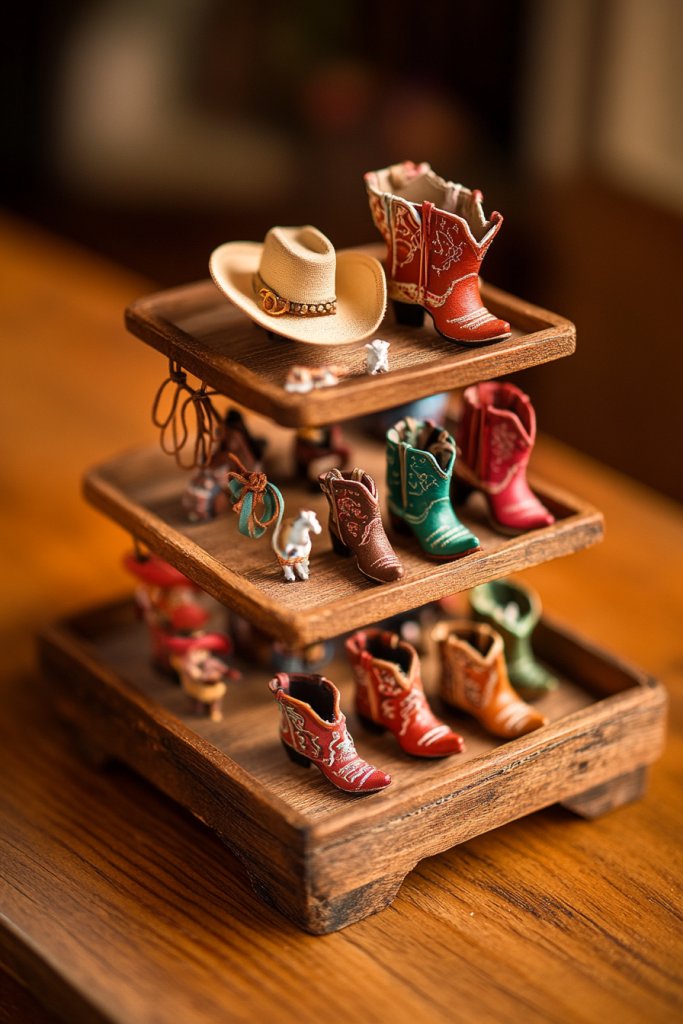 Looking for a way to showcase your love for all things Western without cluttering your space? A tiered tray offers a compact, versatile solution that can be styled with charming cowboy-themed miniatures. It’s perfect for adding personality and storytelling to your decor, especially if you’re short on table space. Plus, it’s just plain adorable.
