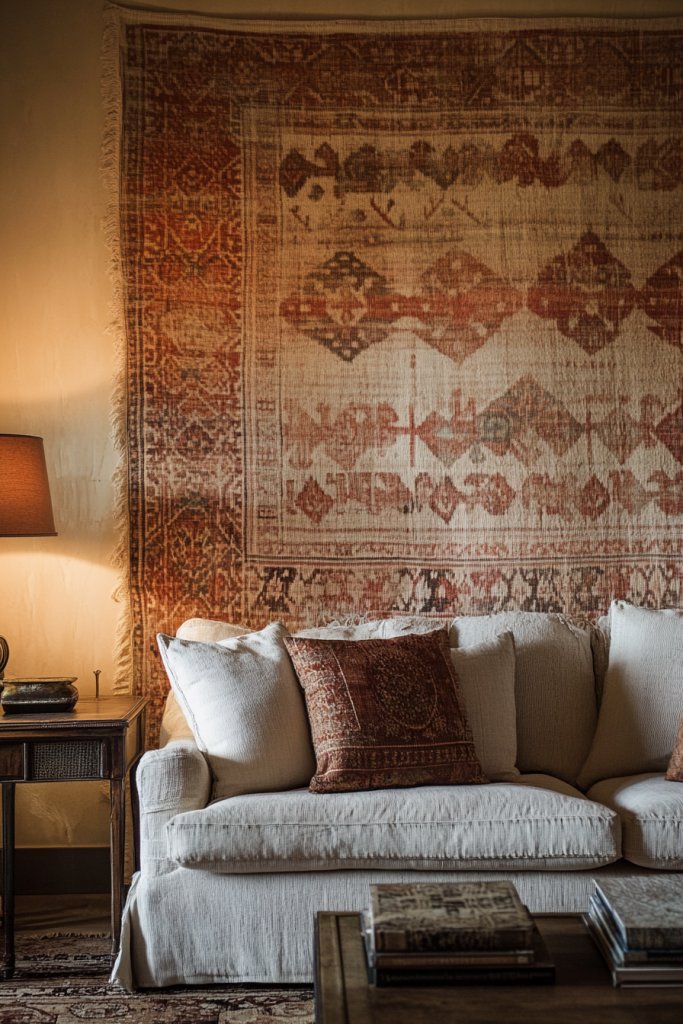 Imagine a large, woven tapestry in earthy tones draped over a sofa or wall, adding visual depth and softness. A set of textured fabric panels in calming hues creates a layered backdrop for your seating area. The tactile quality of the textiles invites touch and adds warmth. Combined with warm lighting, these wall hangings turn a plain wall into a cozy focal point.