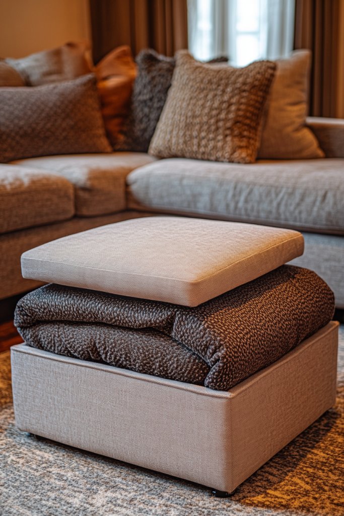 Picture a tufted velvet ottoman in a jewel tone, doubling as a footrest and a place to stash extra throws. It’s placed in front of a plush sectional, inviting you to kick back in style. The ottoman’s soft fabric and elegant design elevate the room’s aesthetic while hiding clutter inside. It’s a perfect blend of practicality and sophistication, making your living room feel more organized and cozy.