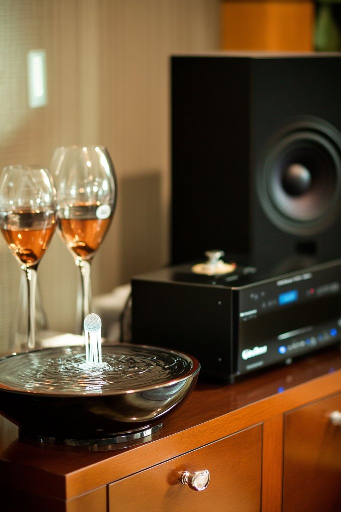 Imagine a tiny tabletop fountain with flowing water, its gentle sound blending with the soft hum of a music system. The water’s movement adds a soothing visual element, while the music offers a calming soundtrack. Soft lighting highlights the fountain’s textures and creates a tranquil glow. Together, they craft an environment that’s perfect for unwinding.