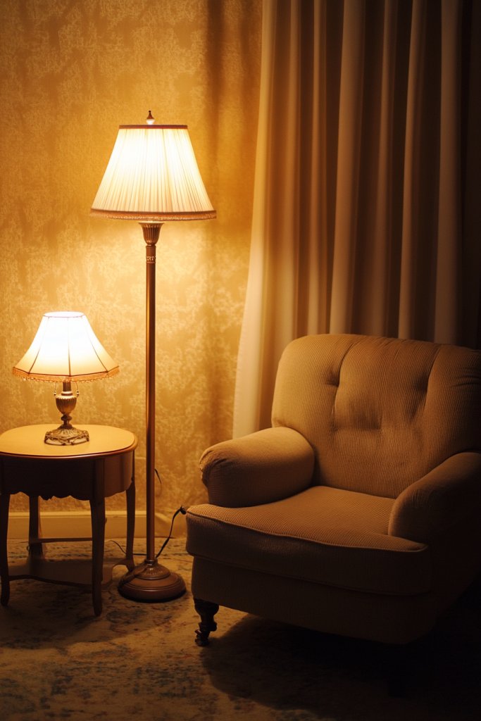 Picture a softly lit corner with a vintage-inspired floor lamp casting a gentle glow over a plush armchair. Nearby, a table lamp with a textured ceramic base and a warm-toned shade adds a cozy pool of light. Together, they create a welcoming ambiance perfect for reading or unwinding. The light’s warmth highlights textures in cushions and throws, making the space feel more intimate. It’s a subtle glow that transforms the entire room.