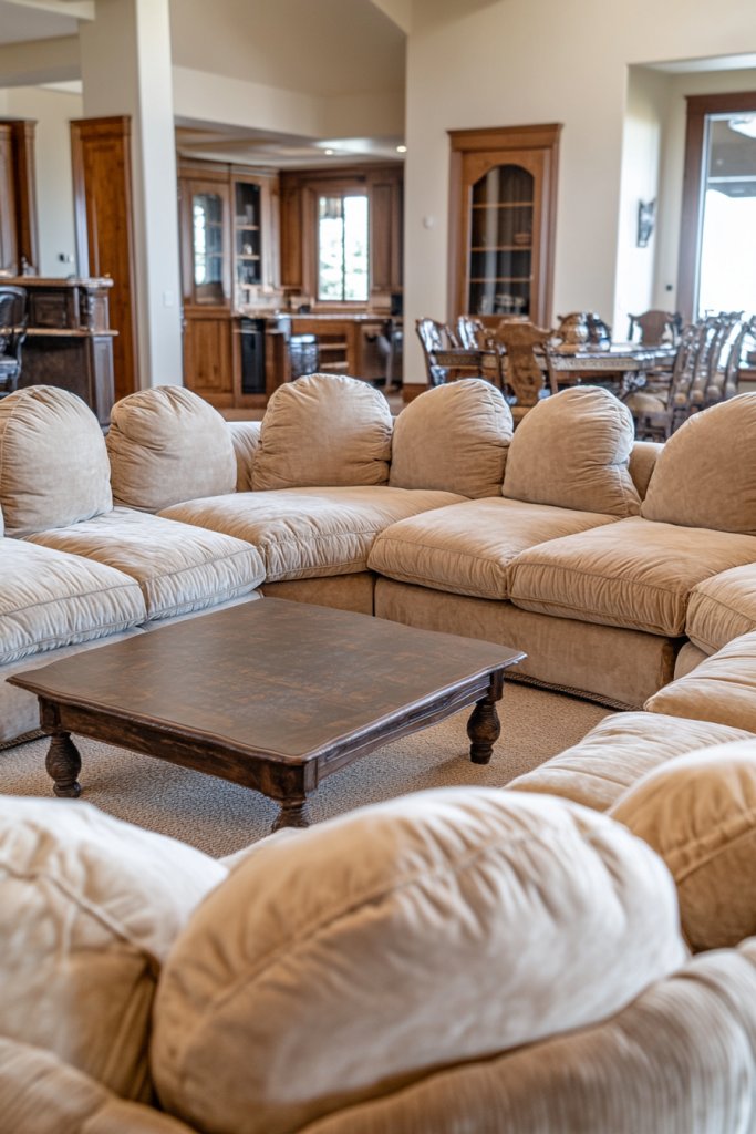 Imagine sinking into a large, plush sectional covered with soft, textured cushions that conform to your body. An overstuffed armchair with a high back and deep seat invites you to unwind with a book or a movie. The fabrics range from velvets to chenille, providing tactile richness. Soft pillows and throws add layers of comfort, while the arrangement encourages conversation and relaxation. It’s seating that feels like a warm hug.