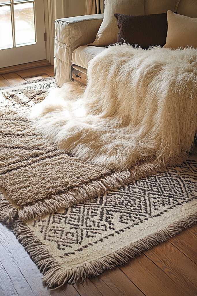 Picture a layered arrangement of rugs—one large, soft cream-colored shag covering the main area, topped with a patterned runner in front of the sofa. The textures range from thick pile to braided or kilim designs, adding visual interest. The plushness underfoot makes every step feel like a mini retreat. The rich textures and layered look soften sharp edges and create a cozy foundation.