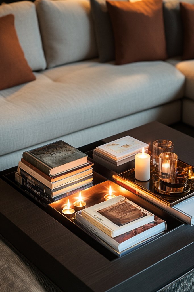 Envision a sleek wooden coffee table with a lift-top that reveals hidden compartments for magazines, remotes, or cozy blankets. The surface is decorated with a simple tray holding candles or a small sculpture, adding personality. Underneath, baskets or drawers hide clutter out of sight. The table’s clean lines and clever storage make the room feel organized and inviting. It’s like a smart, stylish solution that’s also functional.