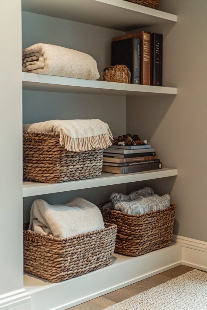 Imagine a wall-mounted shelf lined with woven baskets in natural tones, hiding remote controls, magazines, and other clutter. Open shelving displays carefully curated decor—nothing too busy—keeping the room airy. Decorative baskets in plush fabrics or textured wicker add warmth and organization. The clean, uncluttered look makes your space feel calm and inviting, perfect for unwinding after a busy day.