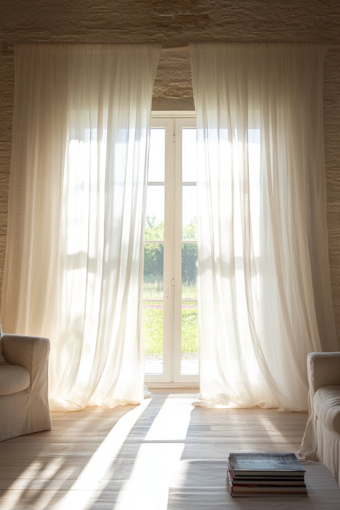 Picture flowing linen curtains in a neutral tone framing your windows, softly billowing with a breeze. Or imagine elegant Roman shades made of sheer fabric, allowing daylight to diffuse evenly across the room. The gentle filtering reduces glare while highlighting textures in your furnishings. The overall effect is a naturally lit, warm space that feels calm and welcoming. The light’s softness adds a touch of serenity to your living environment.
