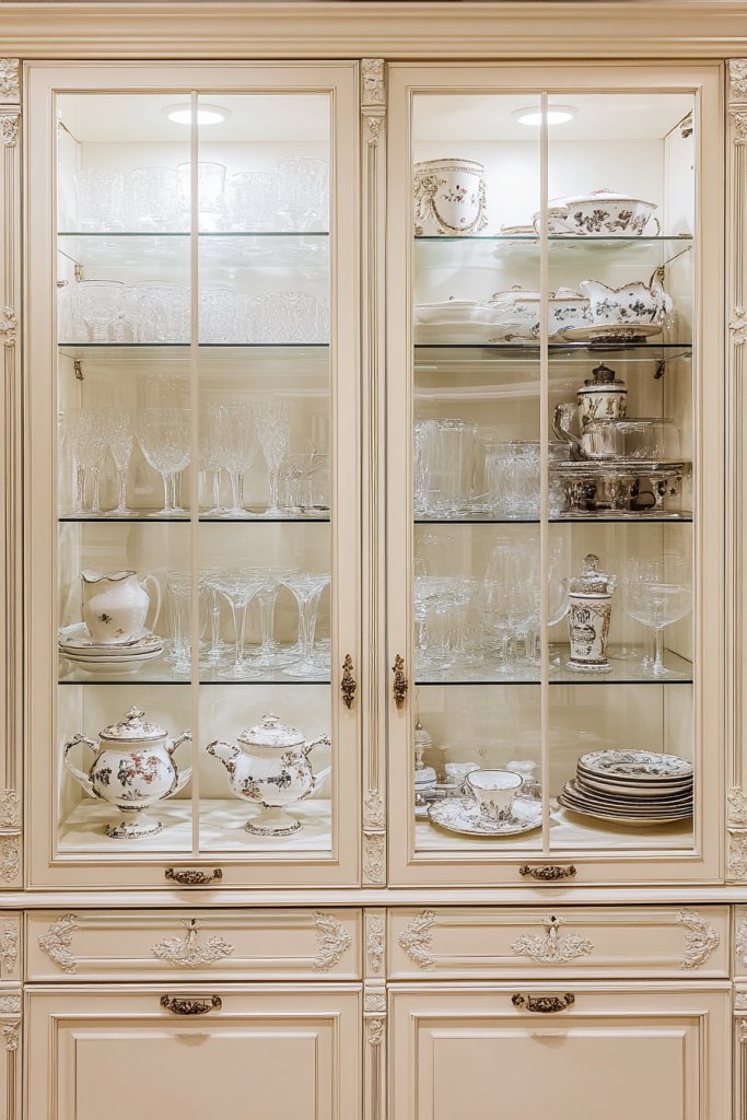 Picture cabinets with delicate glass panes framed in ornate molding, painted in a soft cream hue. The transparency invites glimpses of beautifully arranged dishes or vintage teacups. Pair with antique hardware and distressed finishes for an authentic look that feels like a step back in time.