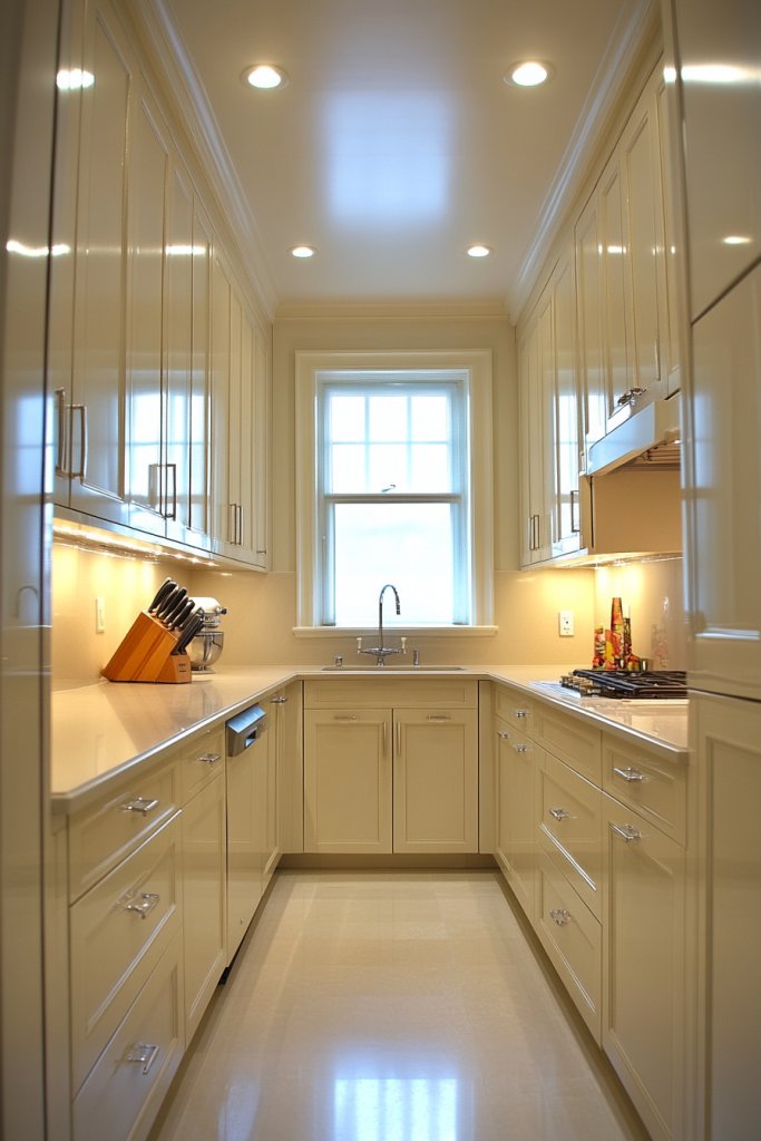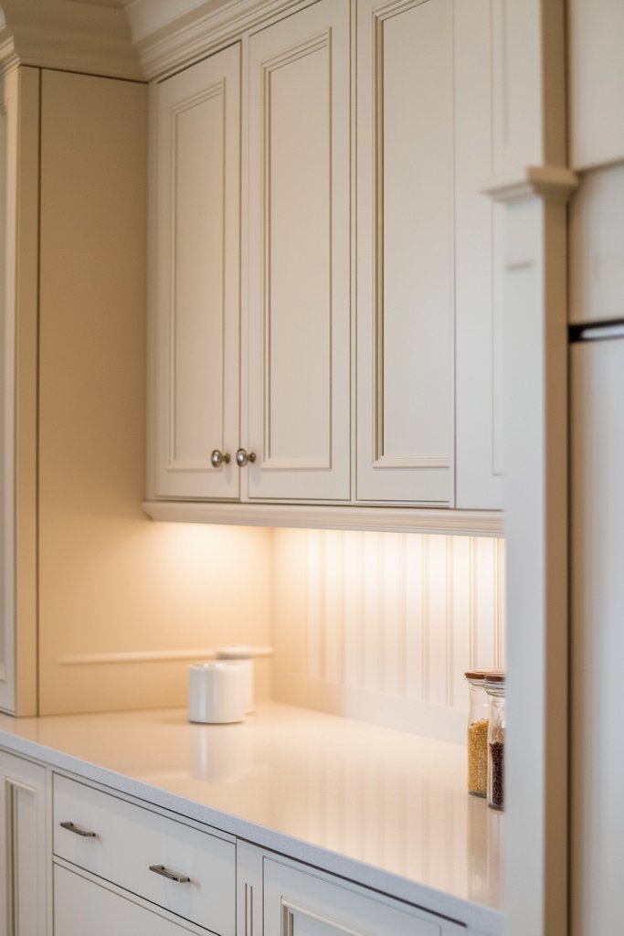 Imagine towering cream cabinets reaching up to the ceiling, with slim profiles that don’t overwhelm the room. The vertical lines draw the eye upward, making the space feel taller and more open. The soft cream color keeps the look light and airy, perfect for small or narrow kitchens.