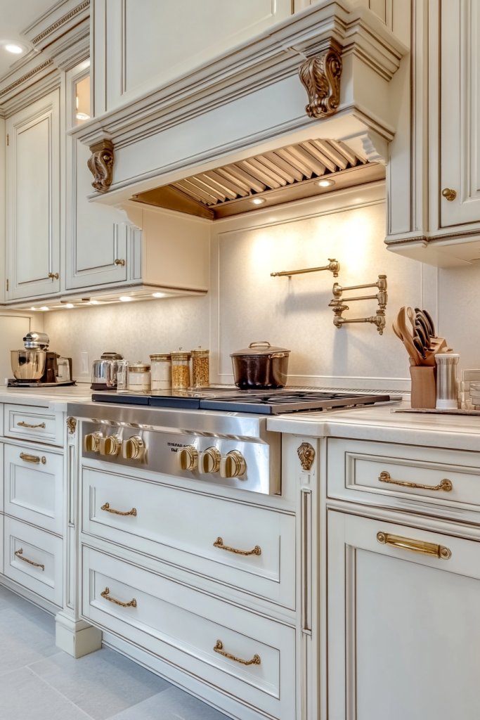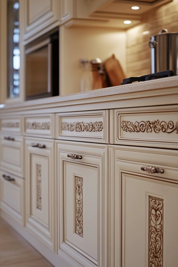 Picture cream cabinets with hand-painted borders, motifs, or intricate detailing along the edges. The decorative accents add a layer of craftsmanship and charm, elevating the overall aesthetic. This approach transforms your kitchen into a personalized gallery.