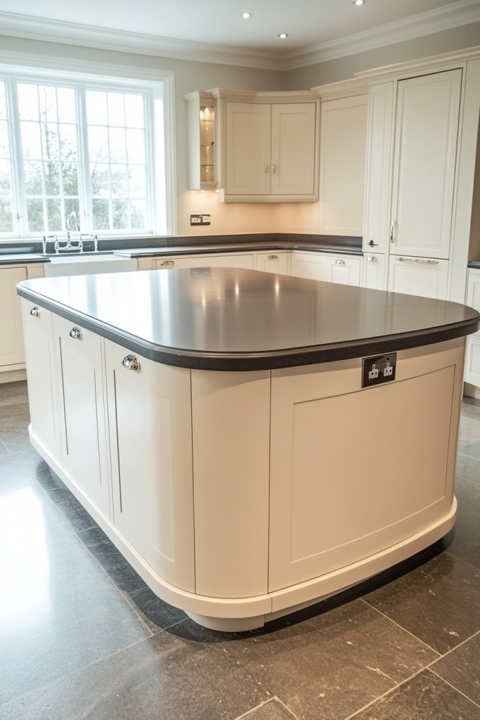Imagine a large island painted in a soft cream hue with a contrasting dark gray countertop or base. The bold contrast draws attention and creates depth, making the island the star of your kitchen. The combination feels modern yet warm, especially when paired with light cabinetry and warm lighting.