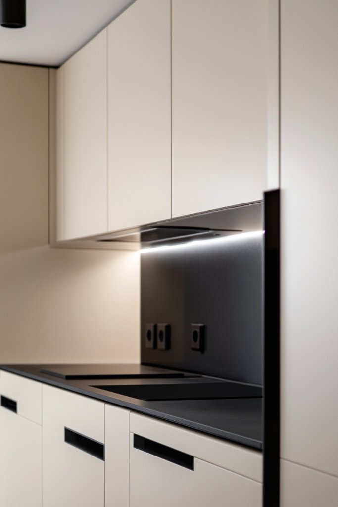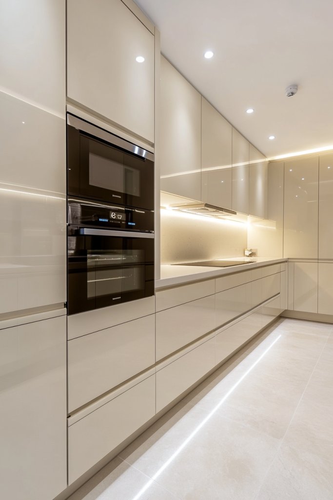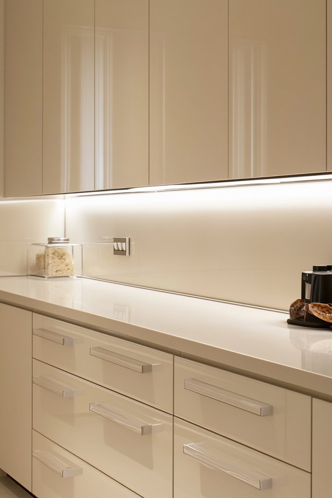 Imagine smooth, unbroken cabinet fronts painted in a soft cream tone, with no visible hardware. The hidden handles are integrated into the design, making the surfaces appear uninterrupted. The overall effect is subtle sophistication, perfect for minimalist or contemporary spaces.