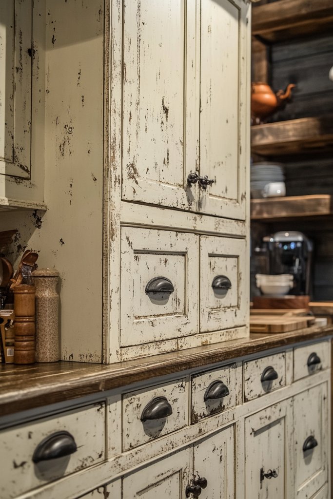 3. Distressed Cream Cabinets for Rustic Charm