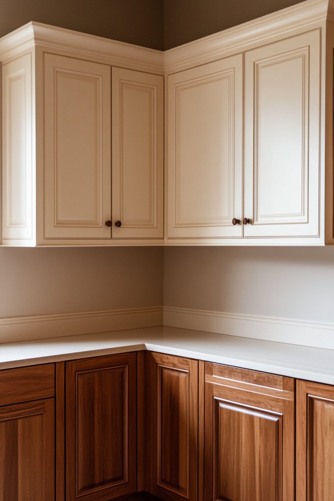 Picture cream upper cabinets contrasted with rich, warm wood lower cabinets. The contrast highlights architectural details and adds visual interest. Natural wood grain textures soften the overall look, making the space feel cozy yet refined. It’s a balance of light and dark that keeps your eyes engaged.