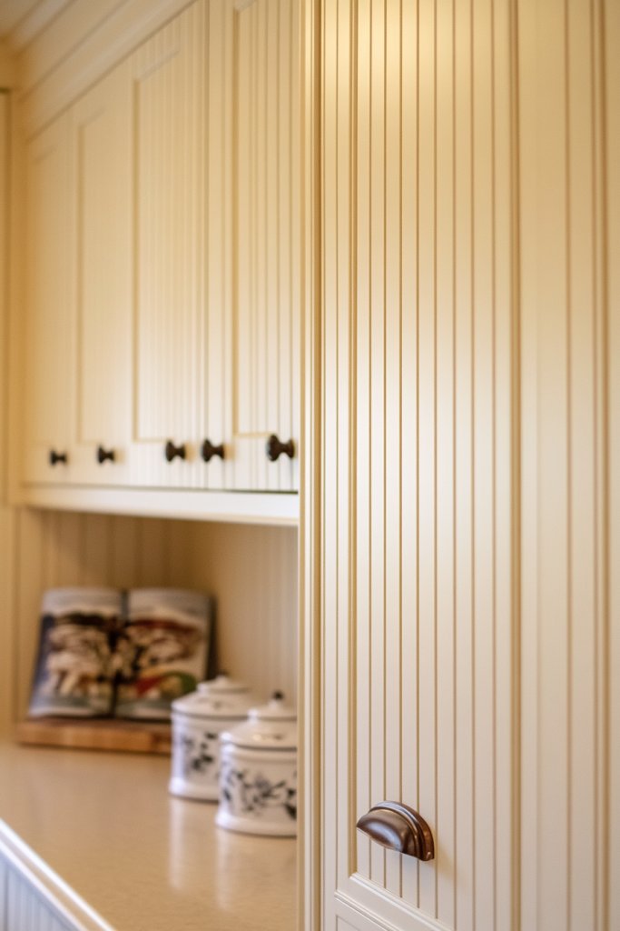 7. Beadboard Cream Cabinets for Cottage-Inspired Style