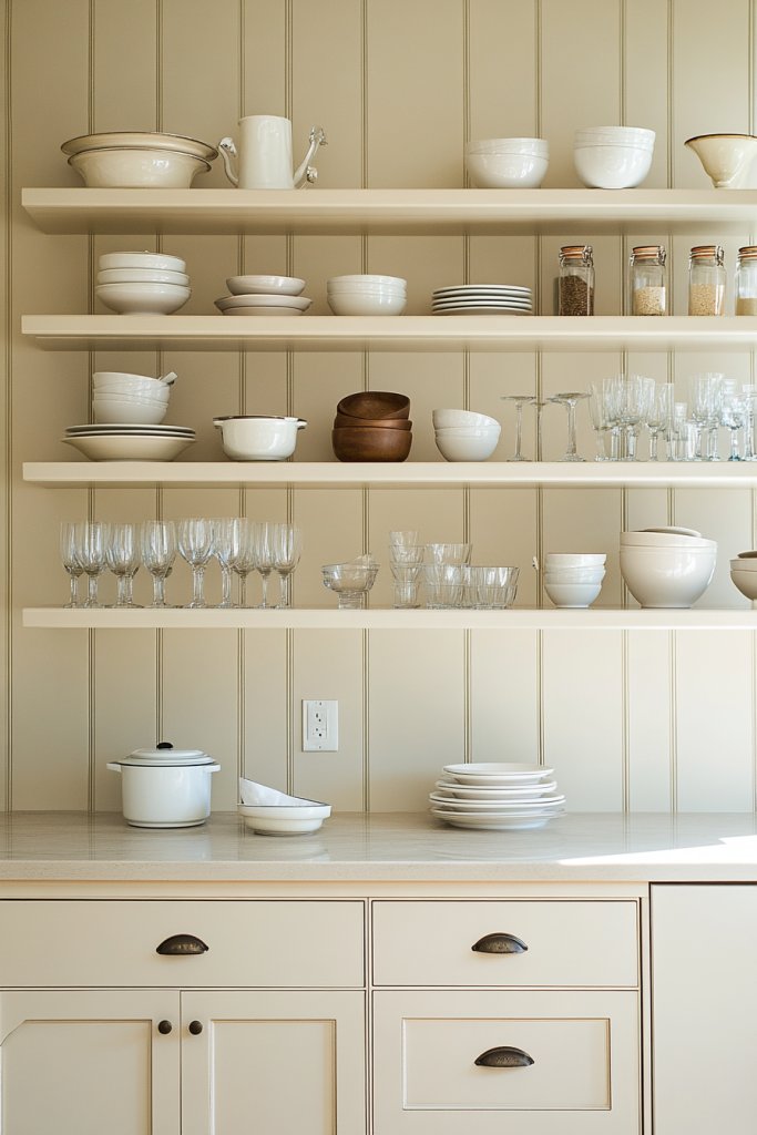 Imagine floating shelves painted in a matching cream tone, holding colorful dishware or decorative bowls. The open design allows for easy access and creates a sense of spaciousness. It brightens the room and invites you to curate a display of your favorite kitchen treasures.