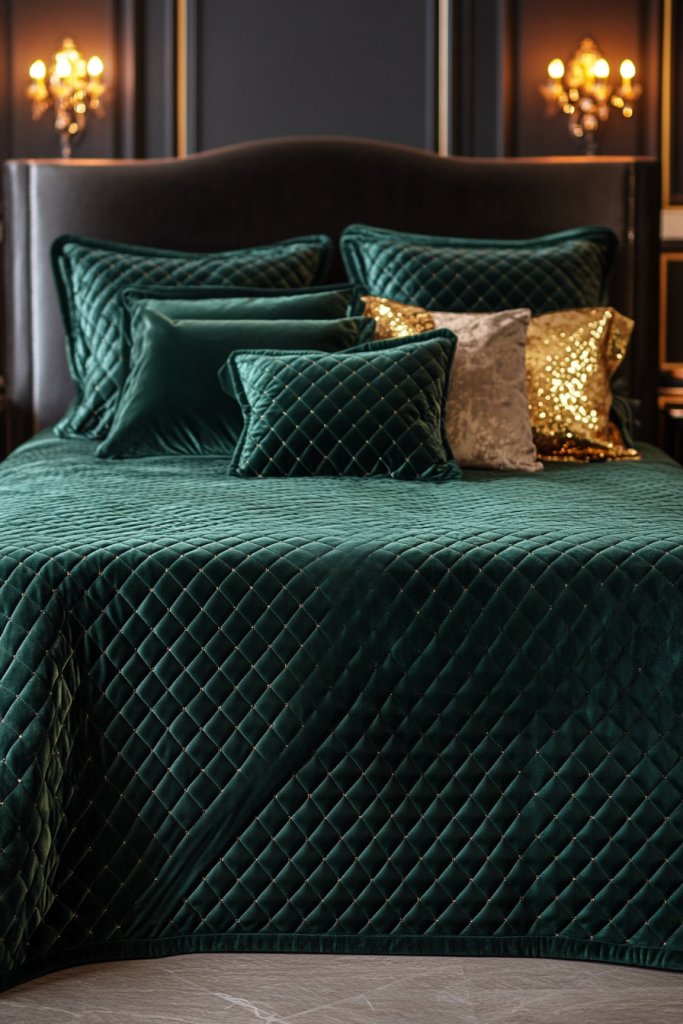Visualize a rich emerald or deep burgundy velvet quilt with diamond or square quilting patterns. The fabric’s subtle sheen catches the light, adding depth and sophistication. The quilt’s padding makes it feel like a giant, cuddly blanket. Pair with velvet or silk pillows and a faux fur throw for extra opulence. The overall ambiance is warm, inviting, and upscale.