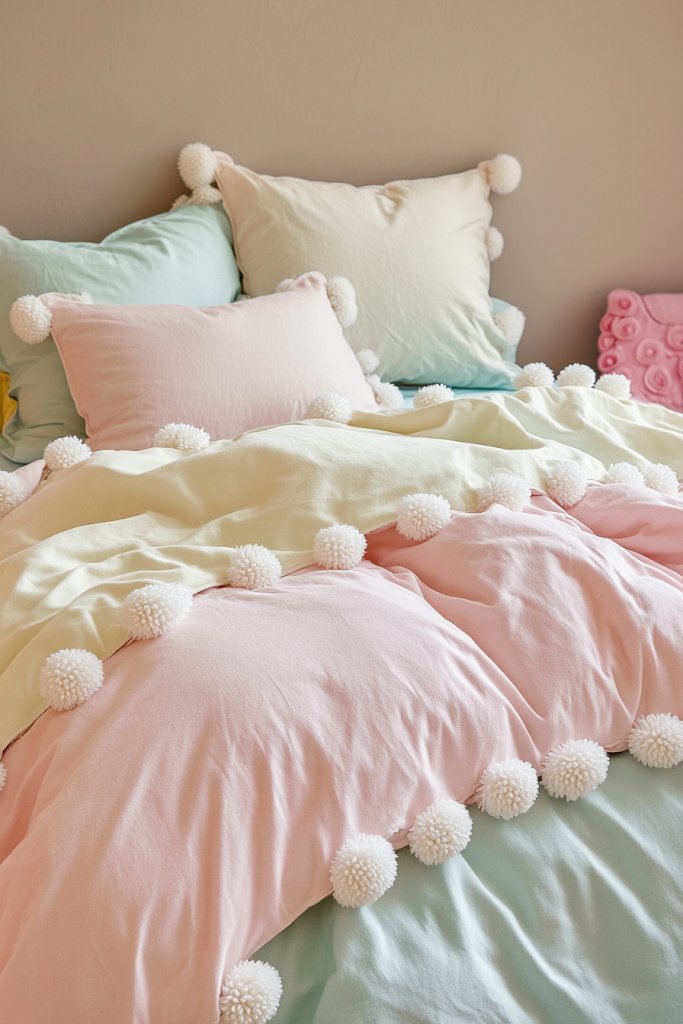 Pom-pom and fringe details make your bed playful and inviting, perfect for a cheerful bedroom. They showcase your love for texture and detail, encouraging you to experiment more with textiles. Confidence grows as you add personal touches and see your creative ideas come to life. Your space becomes a fun, whimsical retreat that’s uniquely yours.