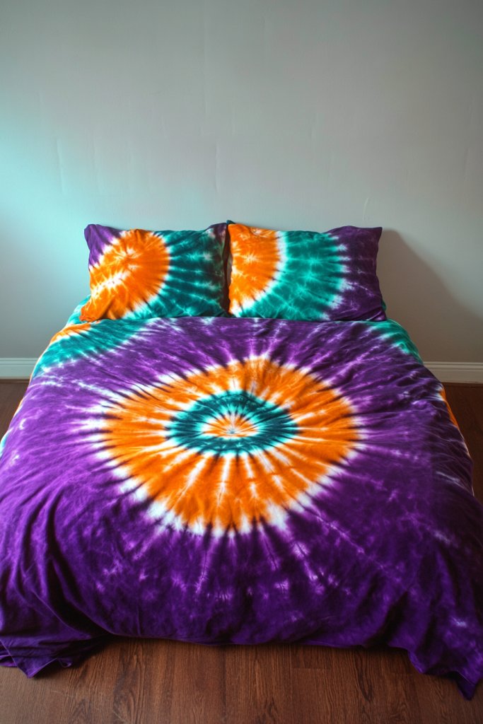 Create your own tie-dye bedspread using fabric dyes and a large bucket or spray bottles. Follow dye instructions carefully for vibrant, lasting colors. Use rubber bands to create patterns before dyeing. Pre-wash fabrics to remove sizing, then soak in water for better dye absorption. Let the fabric dry completely before bed. For a no-fuss approach, buy pre-dyed or tie-dye kits designed for home use. Layer with neutral or patterned pillows for balance.