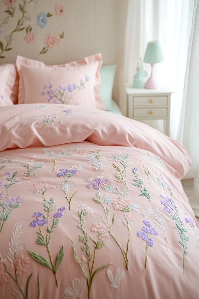 Select high-quality, breathable fabrics like organic cotton or linen for longevity and comfort. Use floral-printed fabric or buy ready-made covers in pastel shades. Adding delicate embroidery or appliqué can elevate the look—consider hand-sewn details for a personal touch. Pair with matching curtains or light textured rugs for a cohesive scene. Keep maintenance simple with washable fabrics and gentle detergents. Layer with light, textured pillows to enhance the whimsical feel.