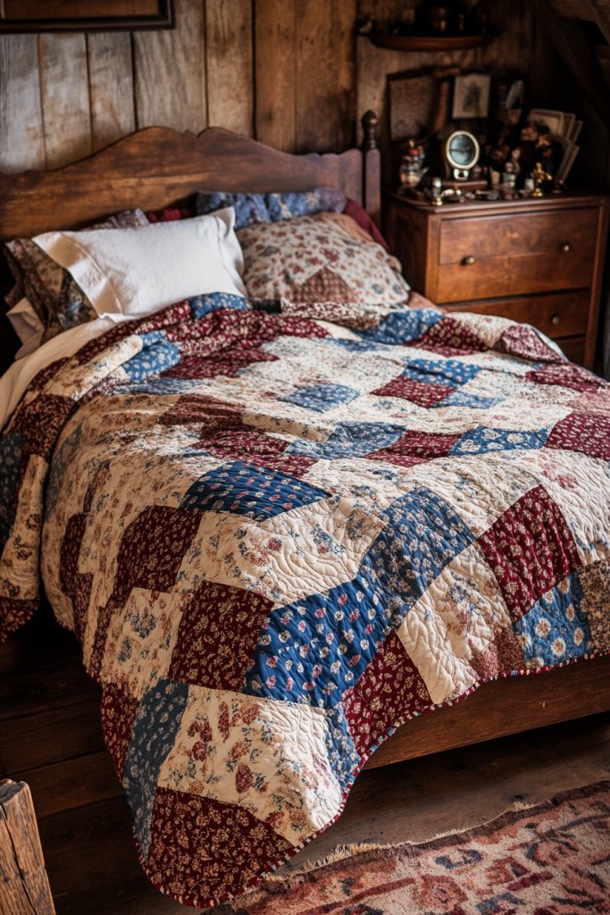 Visualize a quilt made from various fabric swatches—flannel, cotton, even vintage linens—stitched together in a patchwork pattern. The colors range from muted earth tones to vibrant, cheerful hues, creating a patchwork mosaic. The textured surface invites touch, and each piece adds a layer of history and personality. Draped over the bed, it instantly makes the room feel cozy and welcoming.