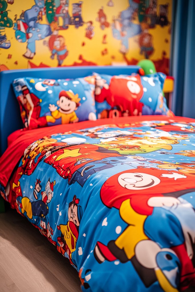 Cartoon-inspired bedding transforms a space into a lively playground that encourages dreams and storytelling. It makes bedtime fun and less of a chore. Your kid will love seeing their favorite characters come to life every morning. It’s a playful way to inject joy and personality into their personal space.