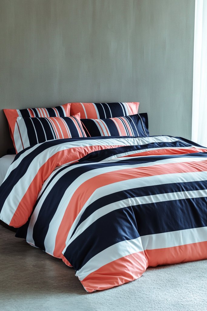 Experiment with narrow or wide stripes, or mix multiple stripe widths for a dynamic effect. Seasonal color changes include cool tones for summer and warm hues for winter. Use stripe patterns with different textures like matte, shiny, or embroidered to add depth. Combine with solid-color sheets or subtle prints to balance the boldness. For an even more modern vibe, incorporate metallic or high-gloss finishes.