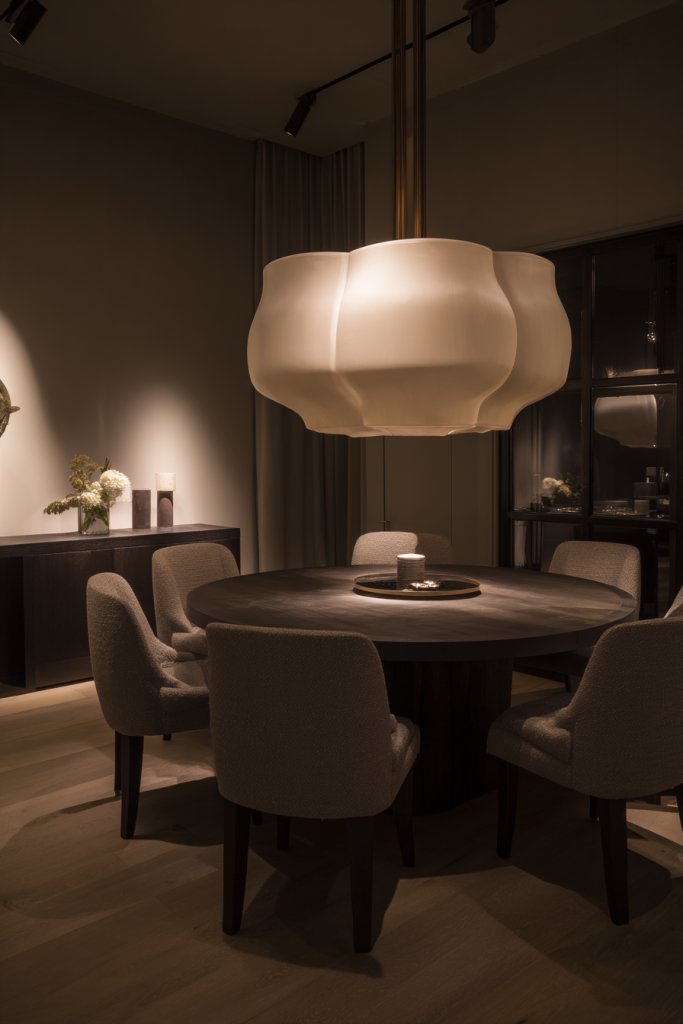 Imagine a sleek, sculptural pendant or chandelier hanging above a stylish dining table. The fixture casts a warm glow, highlighting textured table settings and decorative place mats. Surrounding decor remains minimal, focusing attention on the lighting centerpiece. The overall effect is sophisticated, inviting guests to linger longer.