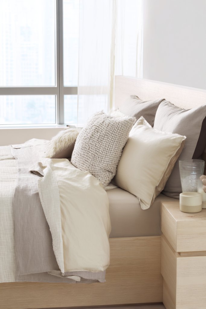 Imagine soft, neutral-colored walls layered with textured bedding, plush throws, and multiple pillows in shades of cream, beige, and taupe. Natural light filters through sheer curtains, illuminating the space without harshness. Light wood or white furniture keeps the room feeling spacious, while a few decorative textiles add warmth and depth. It’s a serene sanctuary.