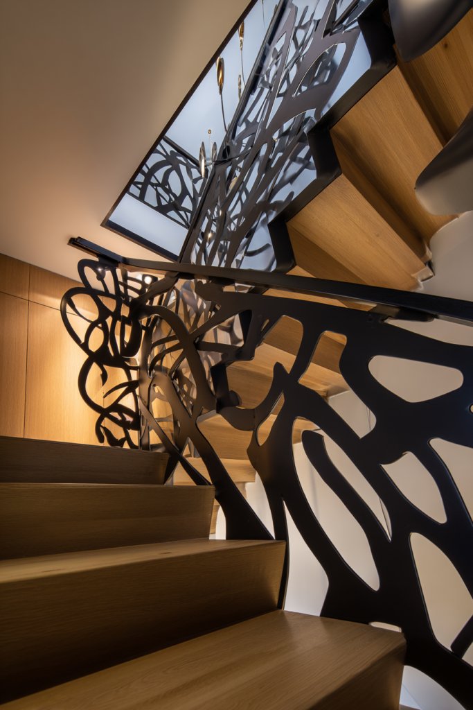 Add decorative elements like embedded LED lights, textured finishes, or painted accents. Personalize the design with motifs or symbols meaningful to you. Complement the staircase with artwork or decorative wall treatments nearby. Regular maintenance and cleaning keep the intricate details looking sharp.