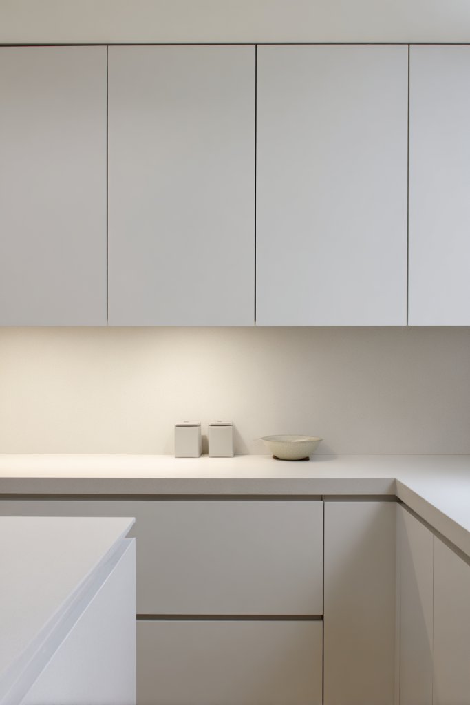 Visualize a kitchen with smooth, flat-front cabinets in matte white, interrupted only by subtle grooves or touch-to-open mechanisms. The countertops are a seamless quartz surface, free of knobs or handles, creating a streamlined appearance. Soft under-cabinet lighting adds warmth, while hidden appliances maintain the clean aesthetic. This setup feels modern, quiet, and effortlessly chic.