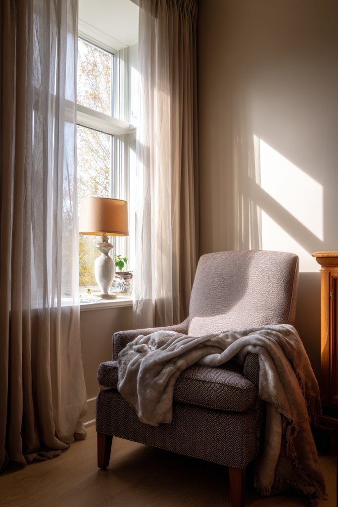 Imagine nestled into a plush armchair covered in soft textiles, positioned beside a large window flooding the space with natural light. A small side table holds your favorite mug and a stack of books, while a textured throw blanket adds warmth. Built-in shelves or a compact bookcase nearby keep your library organized. The ambiance is calm, inviting, and perfect for lingering.