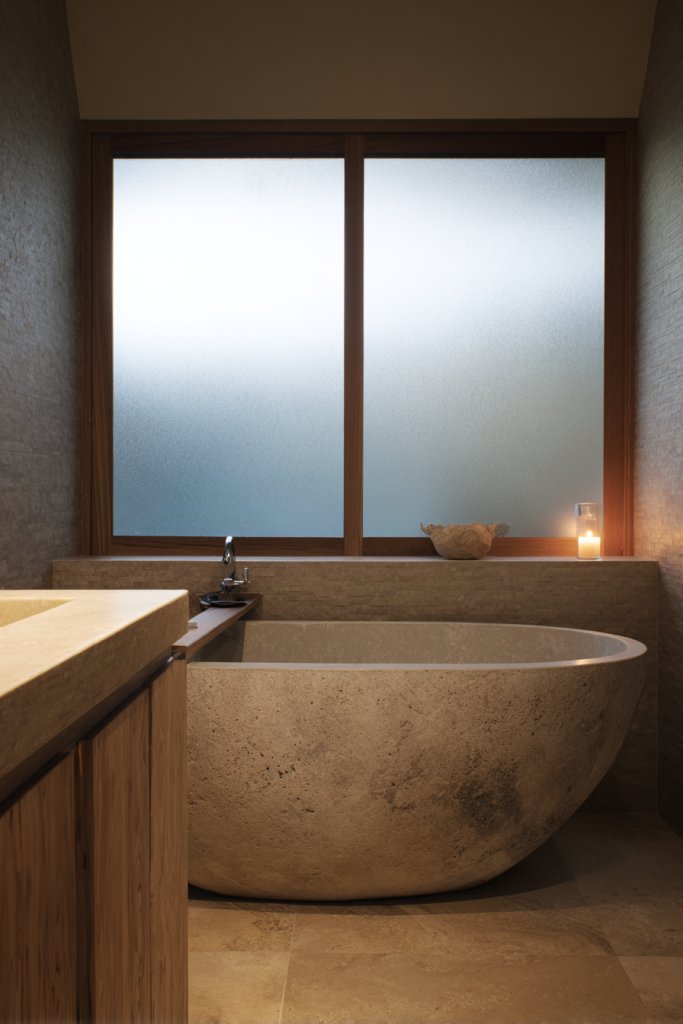 Picture a bathroom featuring a freestanding stone bathtub, surrounded by warm wooden accents and soft, neutral tiles. Soft lighting, possibly from concealed fixtures, creates a soothing glow. Textured stone or bamboo accessories add tactile interest, while plush towels and a gentle scent complete the ambiance. It’s a space that invites tranquility and self-care.