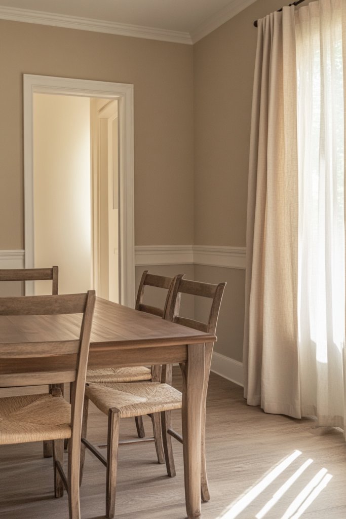 Imagine walls painted in a gentle oatmeal hue, complemented by a cozy, textured throw in a warm cream. Soft lighting bounces off the subtle, warm undertones, making the room glow with understated elegance. The furniture is a mix of matte wood and plush, neutral textiles that exude comfort. This palette fosters an atmosphere where every detail whispers calm, making every dinner feel like a retreat.
