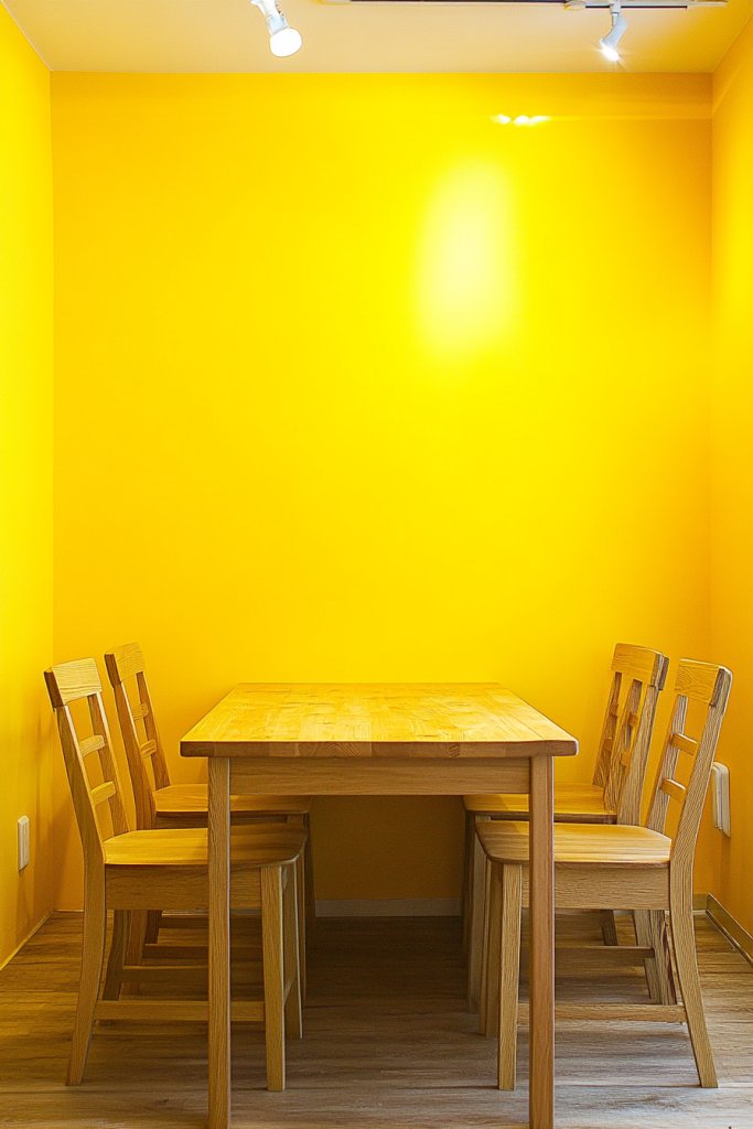 Paint the walls in a high-quality, matte mustard yellow, ensuring even coverage. Use light-colored or natural wood furniture to keep the space light and airy. Add layered lighting—pendant lights, sconces, or table lamps—to enhance the cheerful ambiance. Incorporate playful textiles like patterned cushions or a vibrant rug to add depth. Keep clutter minimal to let the color shine.