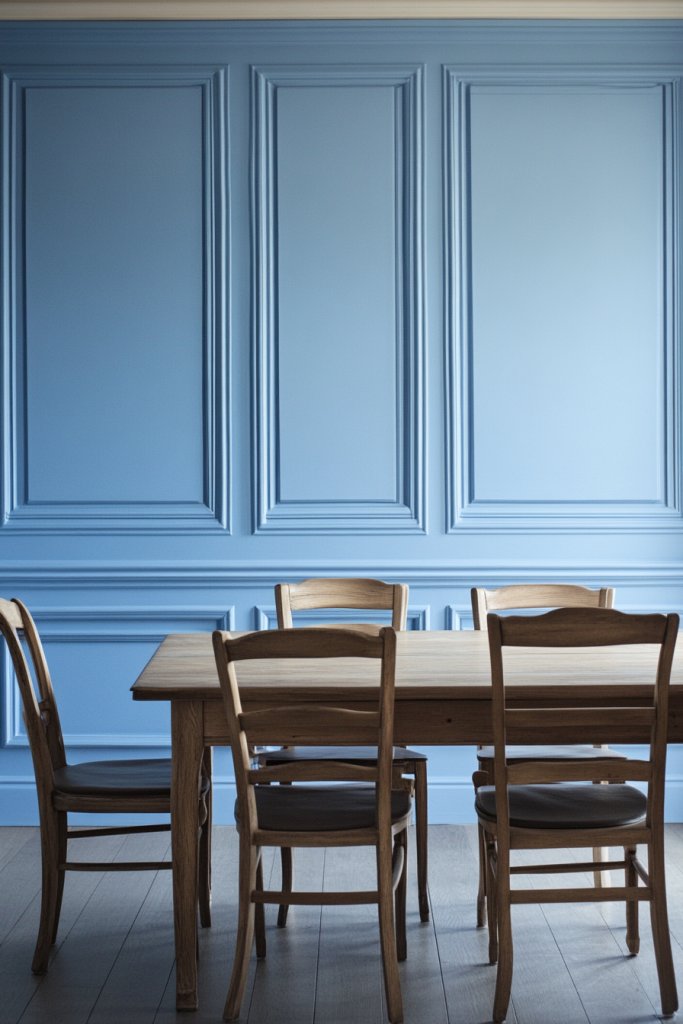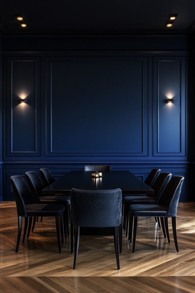 Imagine walls in a rich navy, accented by crisp white trim and warm wood furniture. Soft ambient lighting reflects off the deep hue, creating a cozy yet luxe atmosphere. Add textured fabrics like velvet cushions or woven throws in complementary shades to soften the intensity. The overall effect is a room that feels both commanding and welcoming, perfect for intimate dinners.