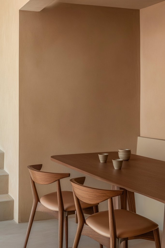 Visualize walls in a soft, muted clay shade paired with sleek, minimalist furniture in natural wood or matte finishes. Textured textiles like linen or woven rugs add depth, while soft layered lighting enhances the subtle warmth. The room feels both modern and inviting, with a refined yet approachable vibe. It’s like a blank canvas ready for your personal touches.