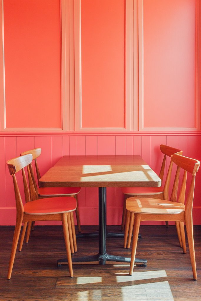 Imagine walls painted in a lively coral hue, paired with white or light wood furniture that balances the boldness. Textured textiles like patterned cushions or curtains in complementary shades add depth. Bright decorative accessories, such as colorful ceramics or artwork, enhance the cheerful vibe. The room feels energetic and inviting, perfect for lively dinners.