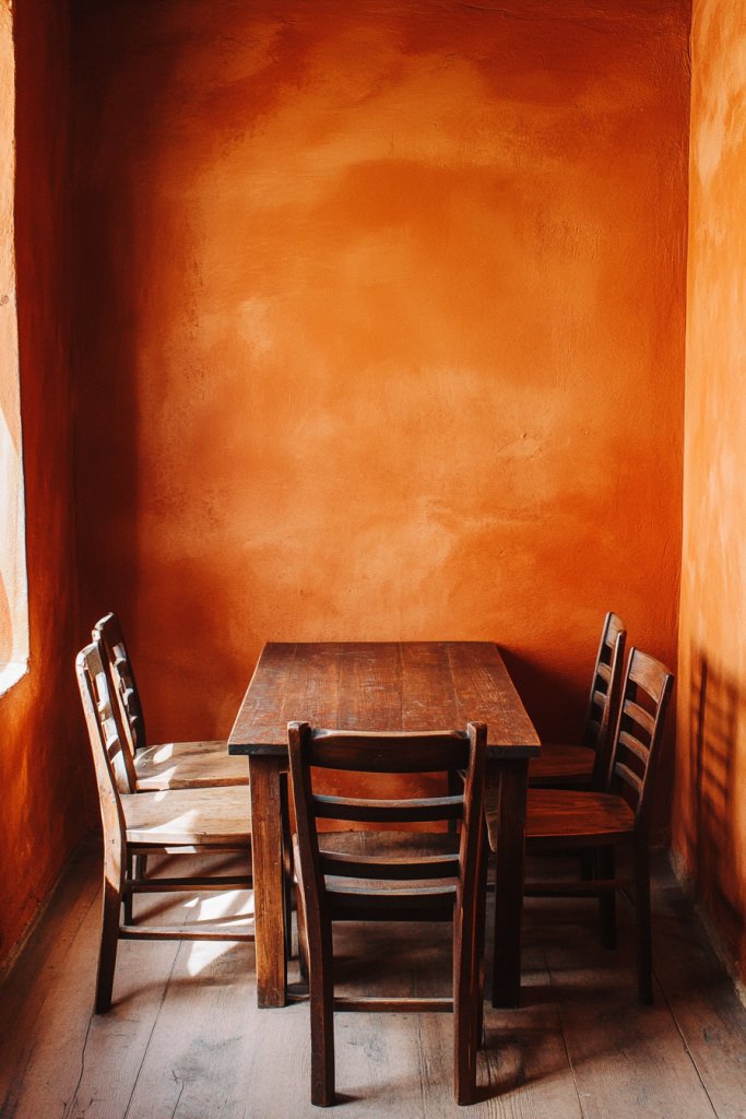 Picture walls painted in rich terracotta, complemented by natural wood furniture and woven textiles. The warm glow of candlelight enhances the orange undertones, making everything appear more inviting. Accents like clay pots or rustic ceramics reinforce the earthy vibe. The room feels alive with warmth, almost like a sunset captured in your walls.