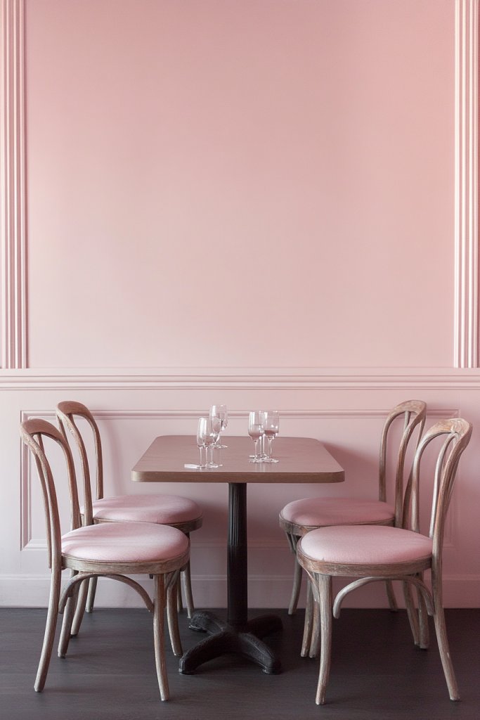 Imagine walls in a dusty rose, paired with textured fabrics like velvet or boucle in complementary shades. The room feels cozy and tender, with candlelight or soft LEDs enhancing the pink undertones. Decor accessories in brushed gold or warm metals add a luxe touch, while plush cushions and throws invite comfort. The overall effect is a romantic, yet understated, retreat.