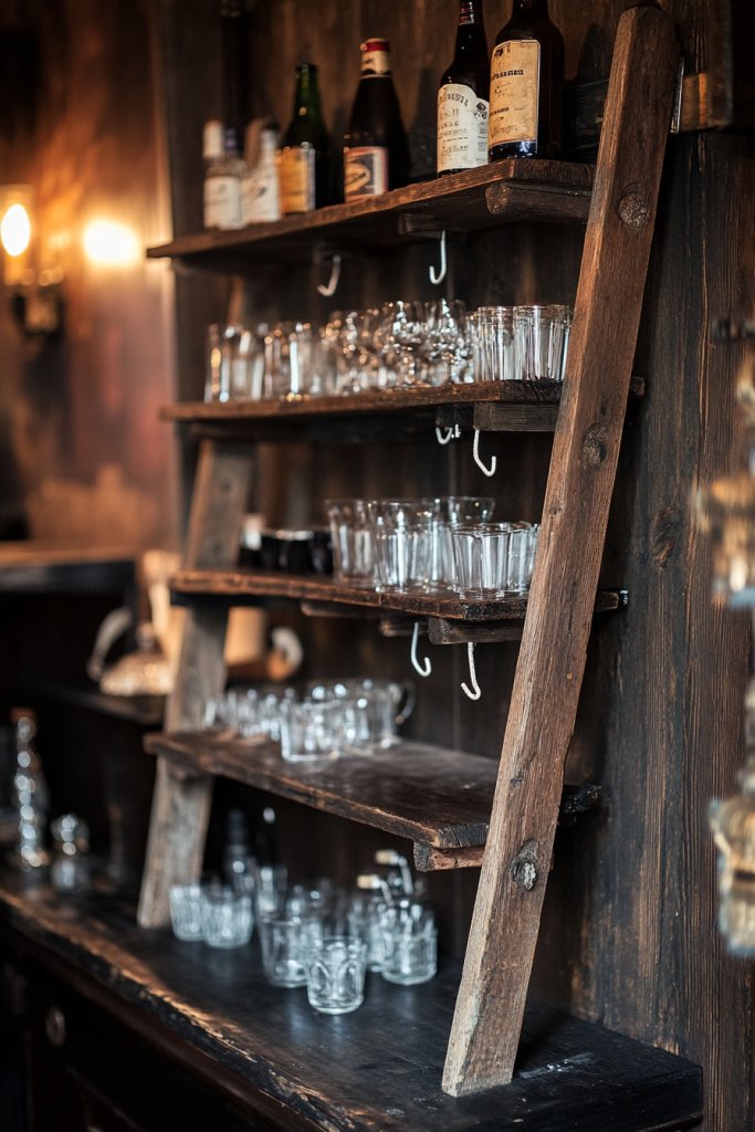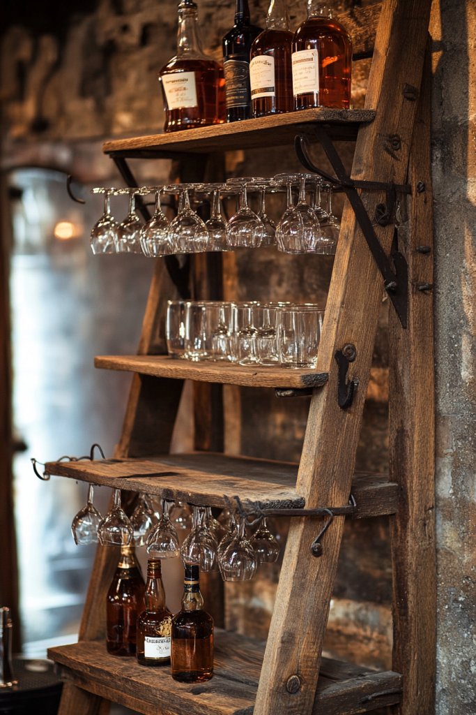 Imagine a vintage wooden ladder leaned against the wall, with glasses hanging from hooks on the rungs and bottles resting on the steps. The worn paint and rustic wood add character, making it a focal point of your entertaining space. String lights or decorative ribbons can enhance the visual appeal. The setup is both functional and decorative, blending practicality with a whimsical touch.