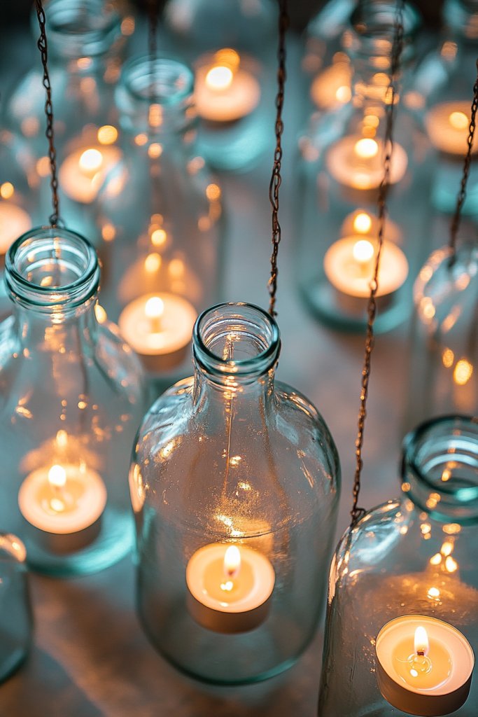 Picture clear glass bottles, cut or drilled to hold candles or fairy lights. The warm flicker of candlelight or the gentle glow of LEDs illuminates the textured glass. You can decorate the bottles with twine, paint, or metal accents for a personalized look. Lining your walkway, hanging from trees, or clustering on tables creates a magical, cozy vibe. The soft light dances on nearby surfaces, transforming your space.
