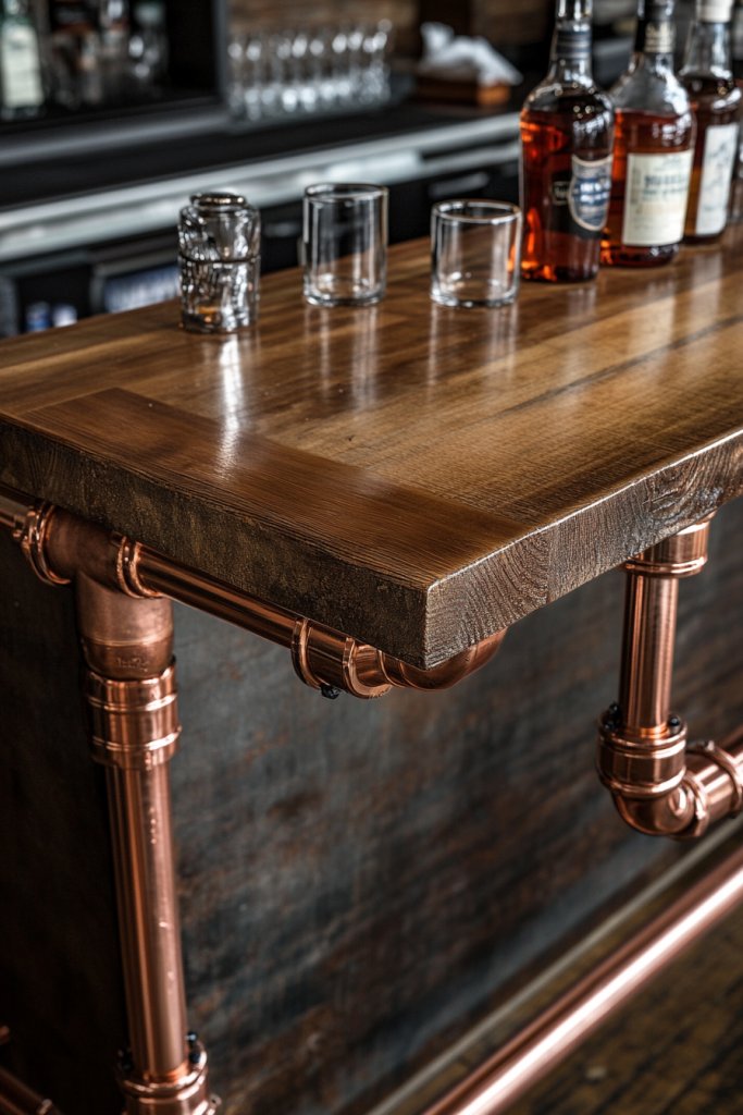 13. Copper Pipe and Wooden Bar Top with Industrial Flair