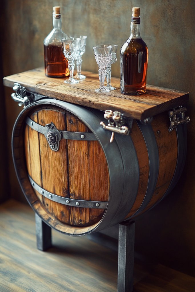 14. DIY Barrel-Style Mini Bar with Metal Accents
