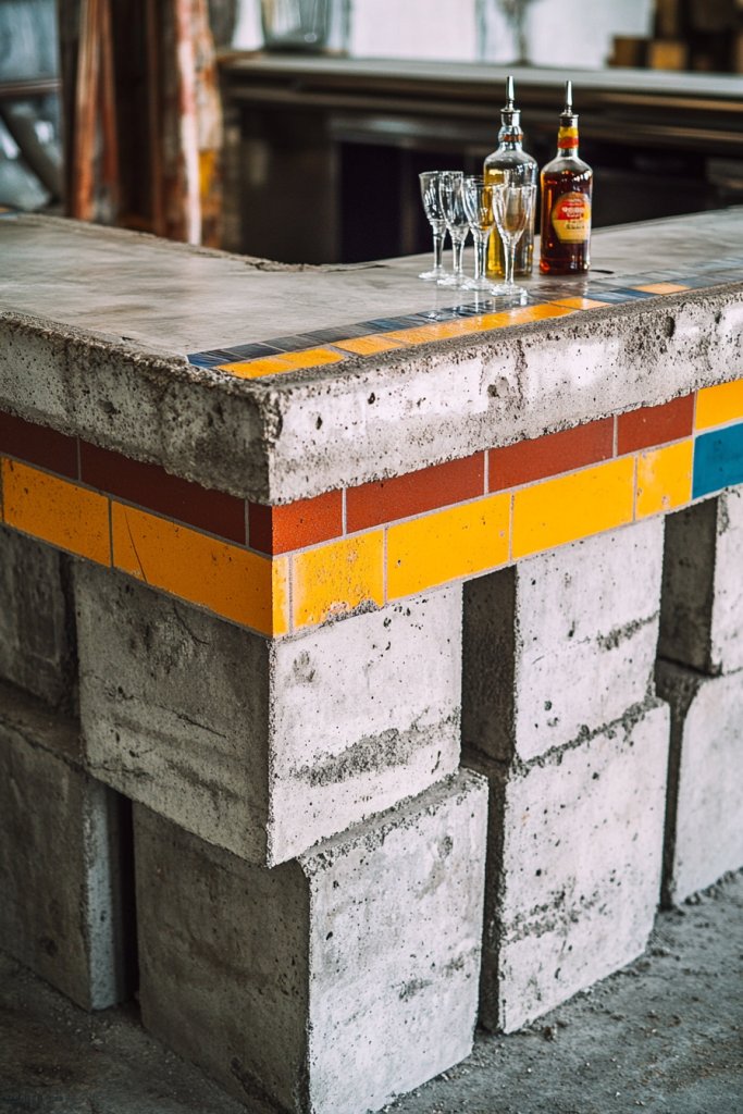 Picture stacked concrete blocks forming the base, with bright tiles or painted sections adding pops of color. The textured surface and rough edges create an urban vibe, contrasted by sleek, modern bar stools or accessories. The vibrant accents catch the light and draw attention, transforming a simple construction into a focal point. It’s a minimalist yet bold aesthetic.