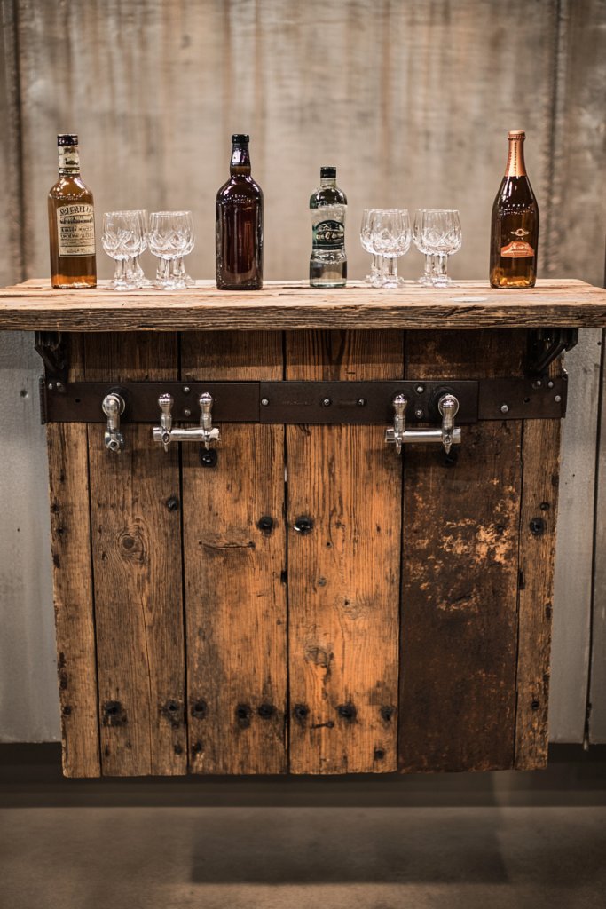 Imagine an old, weathered wooden door, mounted horizontally on industrial pipe legs or brackets. The surface acts as a bar top, while the door’s textured surface and hardware add rustic charm. The finish could be stained or painted for a customized look. It’s a statement piece that combines history and function, perfect for both indoor and outdoor entertaining.