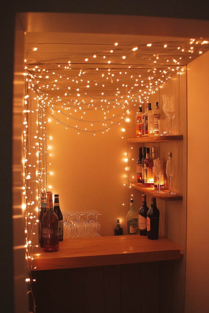 Picture a corner of your room framed by sheer curtains or fabric panels, with fairy lights intertwined along the edges. Inside, a small shelf or table holds your drinks and glasses, bathed in a warm glow. The soft, twinkling light creates a magical atmosphere that encourages relaxed conversations. The enclosure adds a sense of privacy and charm that transforms an ordinary corner into a retreat.