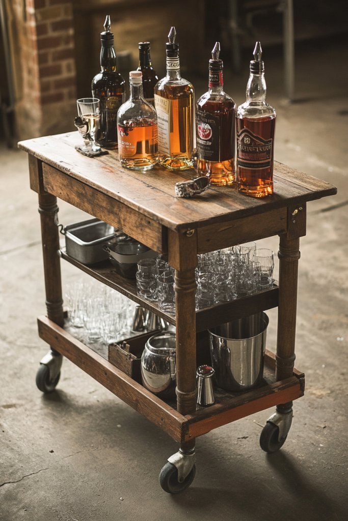 Visualize an old side table, vintage sewing machine cart, or even a sturdy bookshelf repurposed into a mobile bar cart. Casters or wheels are attached for easy mobility, while the surface is topped with a new or refinished wood or metal tray. The combination of different furniture styles adds character, making it a conversation starter. Bottles and glasses are arranged neatly, ready for action.